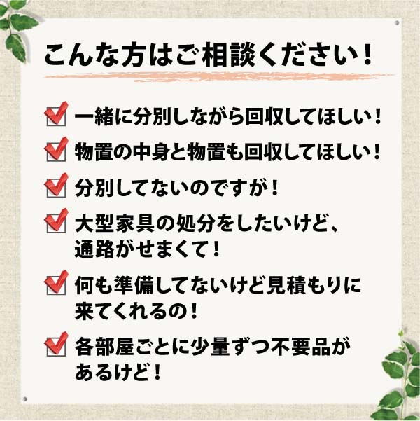 また仏壇や冷蔵庫、大型テレビ、ソファ、タンス、ベッド、食器棚などの重くて大きなものでも大丈夫。お気軽にご連絡ください。